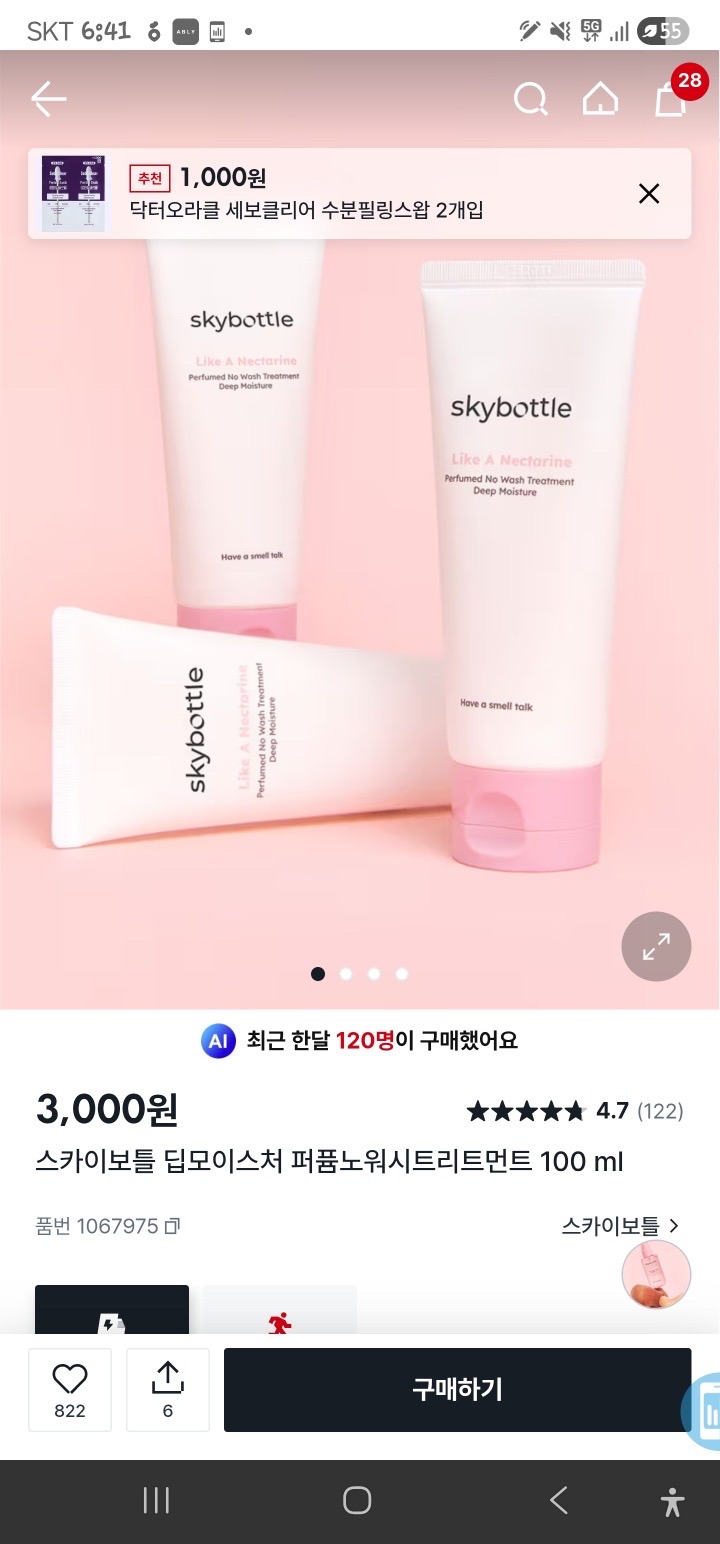 스카이보틀 노워시 트리트먼트 손가락 마디 반 정도?콩알만큼 짜서 젖은 머리 바르고 말린 다음에 헤어오일 발라주면 머릿결 극락감