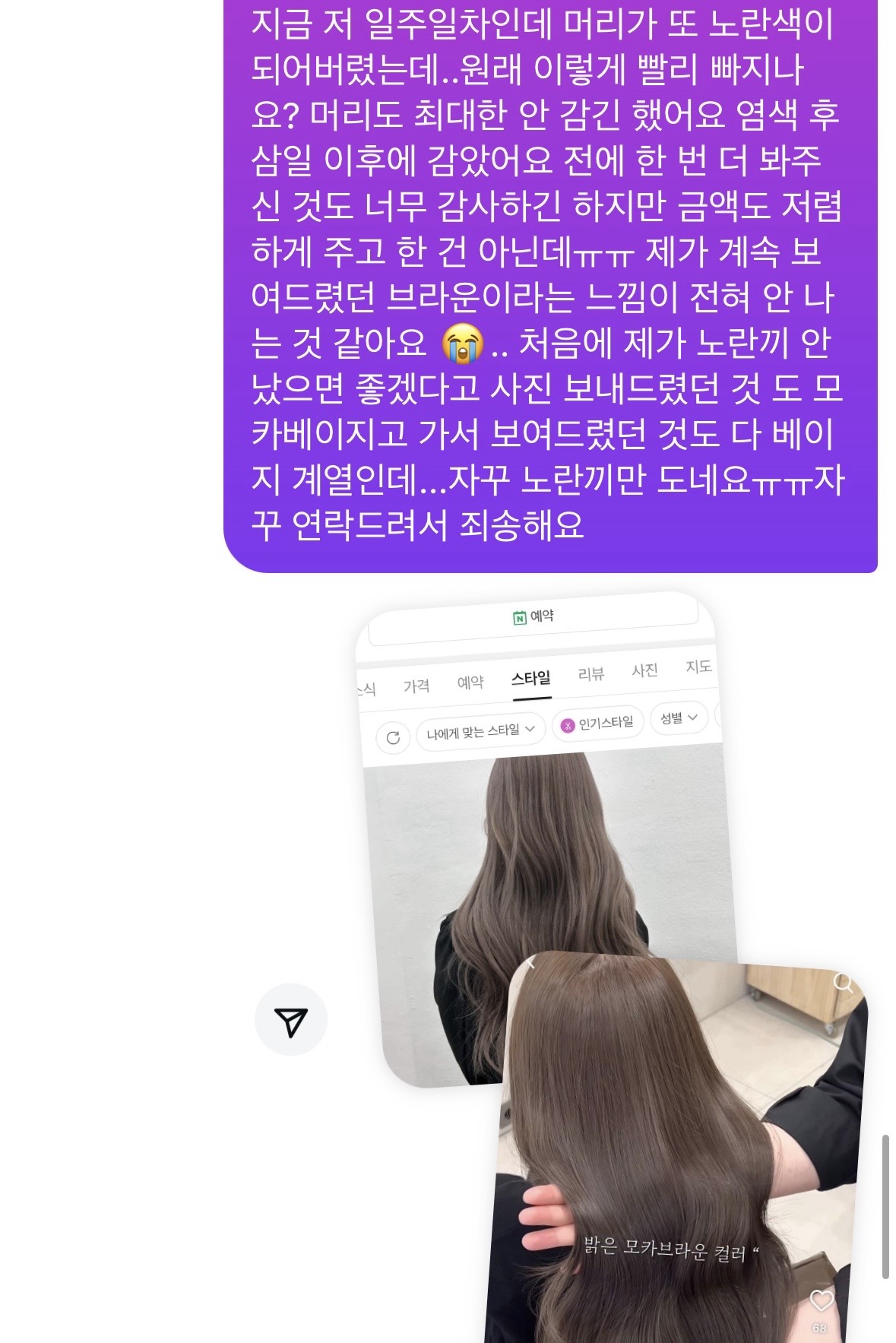 나 미용사인데 애초에 탈색이 필요없는 작업인데 과하게 시술들어갔고 애초에 내눈에는 반사빛베이스컬러자체가 둘다 다름 미용사는 탈색작업이라 빨리빠지는거다라고 노란끼 도는게 싫으면 보색 샴푸 활용해주세요~ 이럴듯 문제는 탈색모는 뿌리자라면 진짜 보기 싫어짐 ㅜㅜ 주기적으로 뿌탈 해줄거 아니면 페이크 블랙이나 톤다운으로 확 덮는게 ... 그래도 빠지긴하는데... 하 ...부분환불이라도 받아내야함 ㄹㅇ